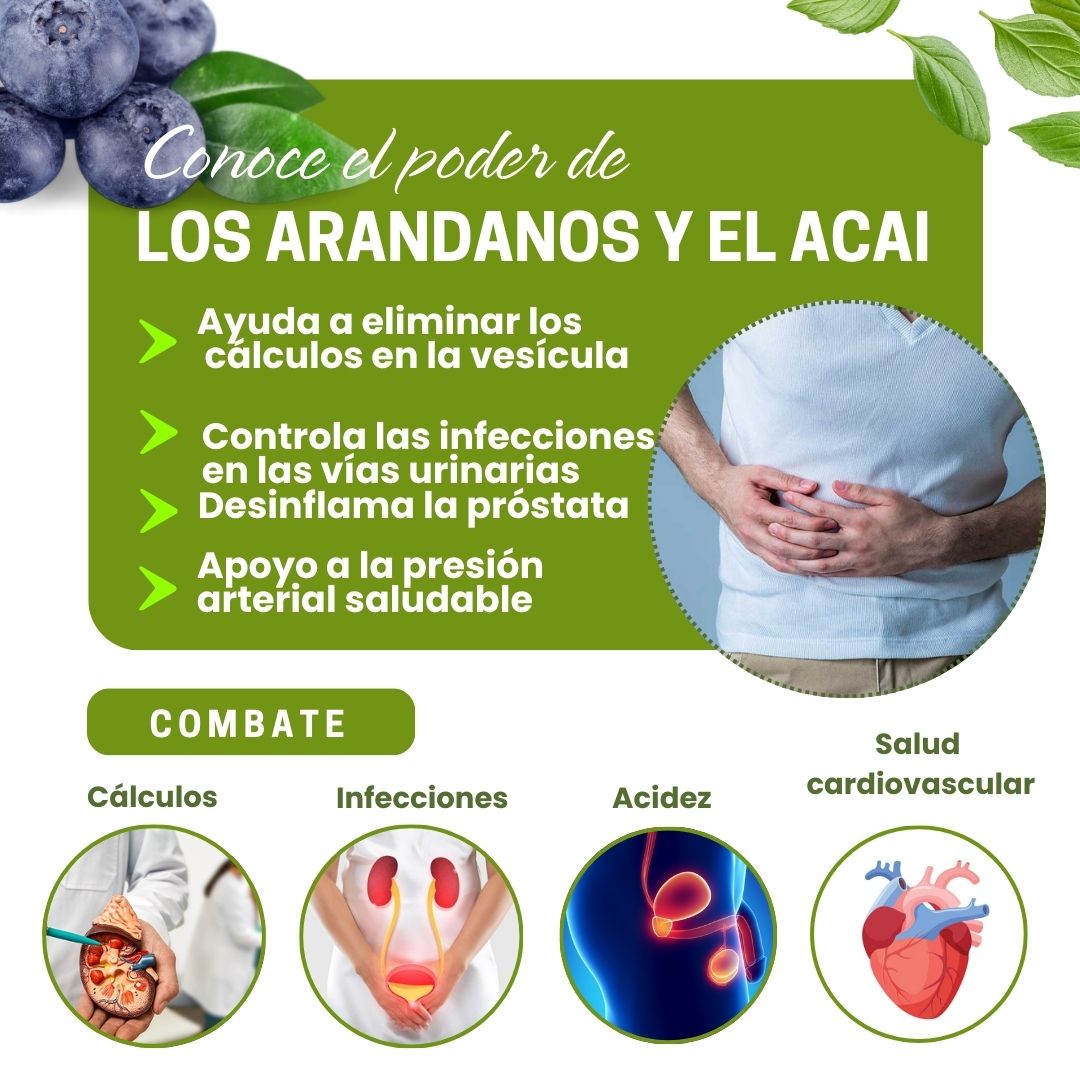 La combinación de arándanos y acaí ayuda a eliminar los cálculos renales y en la vesícula, protege y desintoxica el hígado, reduce la hipertensión, desinflama la próstata, la vejiga y demás vías urinarias.