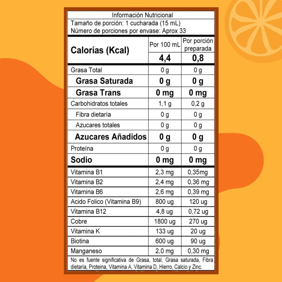 Agua, Malta, Fibra Prebiótica (Inulina y Oligofructosa), Apio (Apium graveolens), Cebolla (Allium cepa), Limon (Citrus limonum risso), Ácido Cítrico (Acidulante), Goma Xantan (Espesante), Citrato de Sodio (Regulador de Acidez), Sabor Artificial Idéntico al Natural Mandarina (Saborizante), Stevia (Edulcorante), Benzoato de Sodio (Conservante), Vitamina B6, Sulfato de Manganeso, Vitamina B1, Vitamina B2, Sulfato de Cobre, Biotina, Ácido Fólico, Vitamina K, Yoduro de Potasio, Vitamina B12.