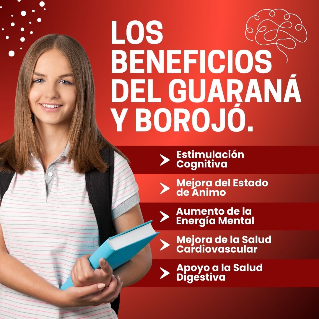 Aumento de la Energía Mental: El guaraná proporciona un impulso de energía que puede ayudar a combatir la fatiga mental, lo que permite mantener la productividad durante períodos prolongados de estudio o trabajo.